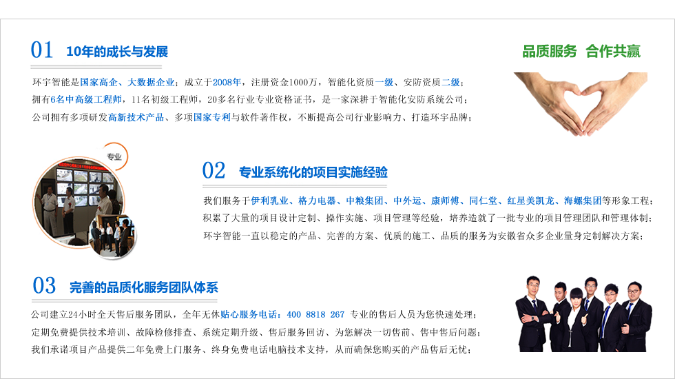 合肥市環(huán)宇智能工程有限公司成立于2008年,科創(chuàng)版上市企業(yè),現(xiàn)注冊(cè)資金1000萬(wàn)整,電子與智能化系統(tǒng)集成資質(zhì)壹級(jí),安防資質(zhì)級(jí),是“國(guó)家高新技術(shù)企業(yè)”、“合肥市高新技術(shù)產(chǎn)品認(rèn)定企業(yè)”、“安徽省安防協(xié)會(huì)會(huì)員單位”、“AAA級(jí)信用等級(jí)認(rèn)證企業(yè)”、“AAA級(jí)重合同守信用企業(yè)”、“合肥市創(chuàng)新型企業(yè)”、是行業(yè)領(lǐng)先的智能化整體解決方案的集成商。